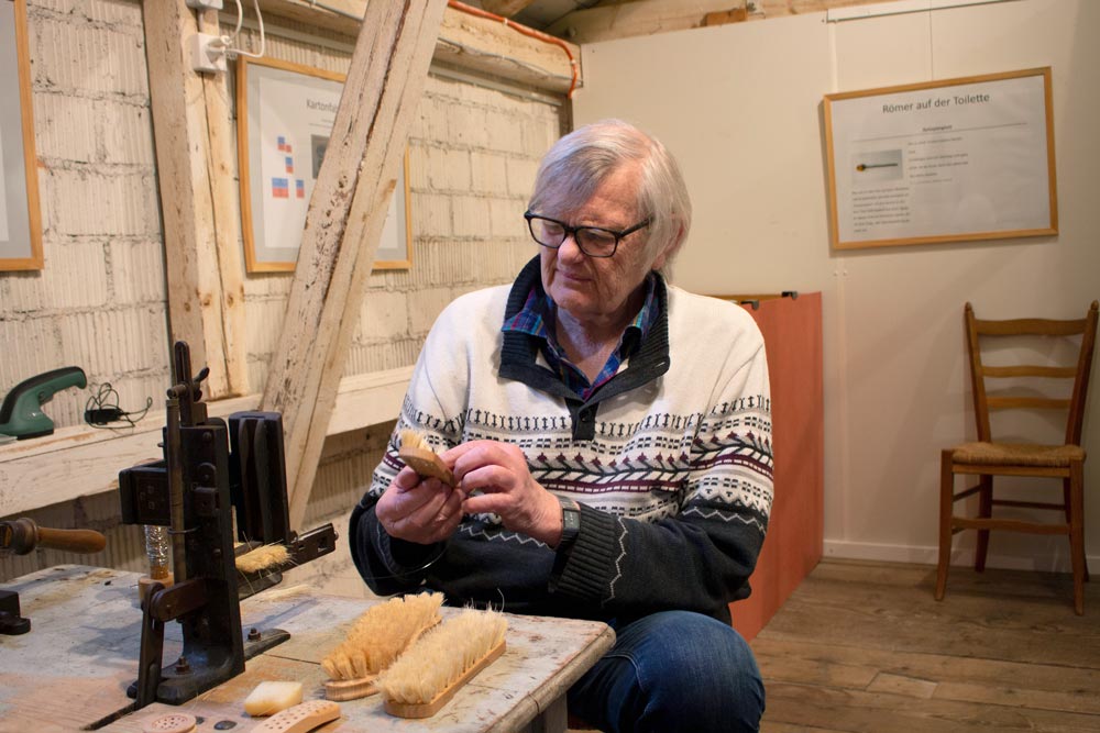 Der Museumsleiter Christian Heilmann präsentiert die Bürstenherstellung an einem Arbeitsplatz um das Jahr 1900.